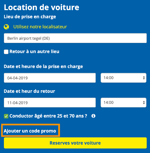 Dans la première étape de la réservation, vous avez la possibilité d’ajouter un code promo. Vous avez travaillé toute l’année et vos vacances arrivent. Il est temps de se détendre. Avec Alamo vous pouvez vous donner tous les luxes sans vous ruiner !