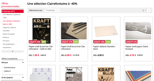 Si vous voulez voir plus de rabais : rendez-vous dans les offres promotionnelles, situées à la fin du menu déroulant. On y trouve en effet 10 sections : Supports, toiles et chevalets, dessin et pastel, pinceaux, arts graphiques, céramique, modelage et sculpture etc., il y en a pour tous les goûts !